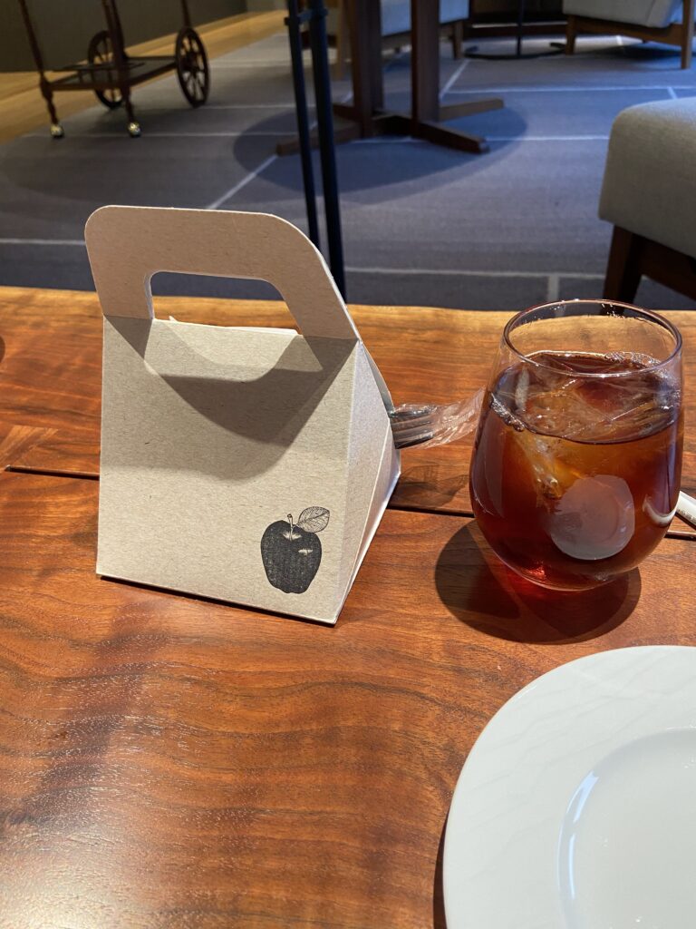 ホテルに戻る前、私たちは、La Voitureというタルトタタンで有名なお店に行く予定にしていた。友達が京都に行ったらここのタルトタタンを食べたいと熱望していたお店。ようやくお店に着いて入ると、残念なことにカフェスペースはクローズとのこと。テイクアウトがOKだったので買って帰り、ホテルで食べることに。チェックイン後、お部屋に行く前に、宿泊者専用のラウンジに行き、そこでタルトタタンをいただくことにした。ラウンジで冷たく美味しいアールグレーのアイスティを作っていただき、タルトタタンをいただいた。タルトタタンは、リンゴの味が生きていて、思ったよりさっぱりとしていて、丁寧に作られていることが感じられ、とても美味だった。お取り寄せも可能なのが嬉しい。